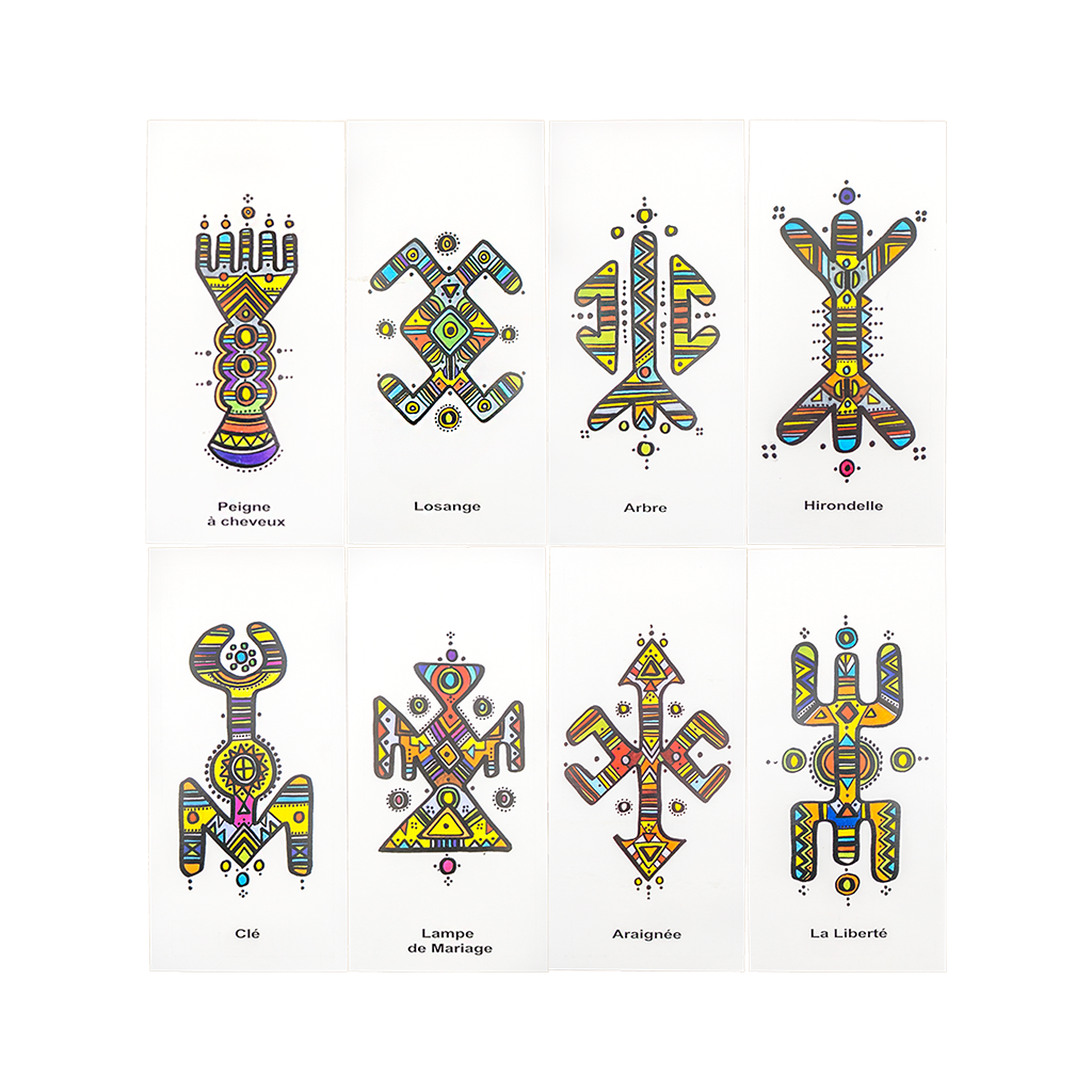 Collection Aframaz de cartes postales de symboles amazighs colorés. Chaque carte explique un symbole de la culture kabyle et amazighe.
