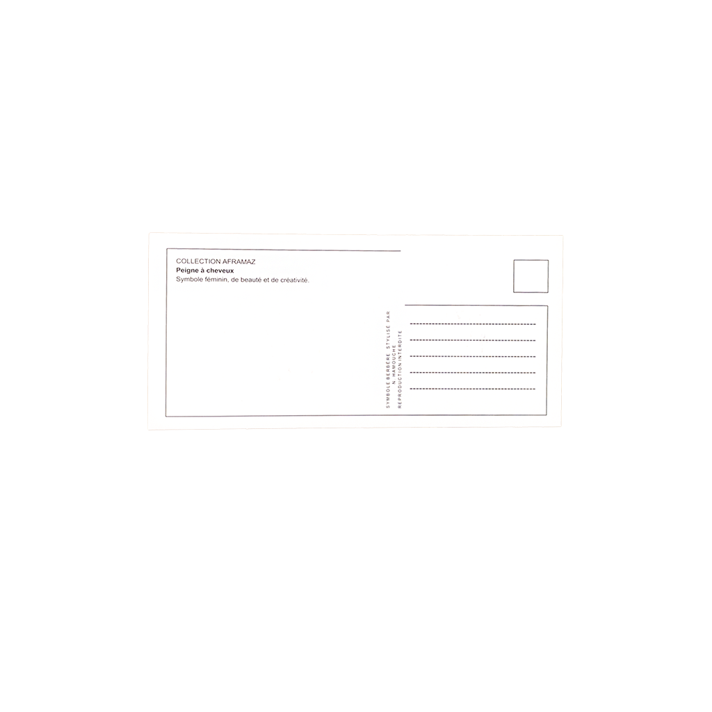 La collection Aframaz de cartes postales de symboles amazighs stylisés et colorés met à l’honneur la richesse de la culture kabyle et amazighe. Chaque carte présente un symbole graphique fort, revisité dans un style moderne et lumineux. Les couleurs vibrantes attirent l’œil. Les formes racontent une histoire. Chaque motif évoque une valeur essentielle : le lien avec la nature, la féminité, la liberté ou encore la résilience. Au dos de chaque carte, une courte explication dévoile la signification du symbole.
